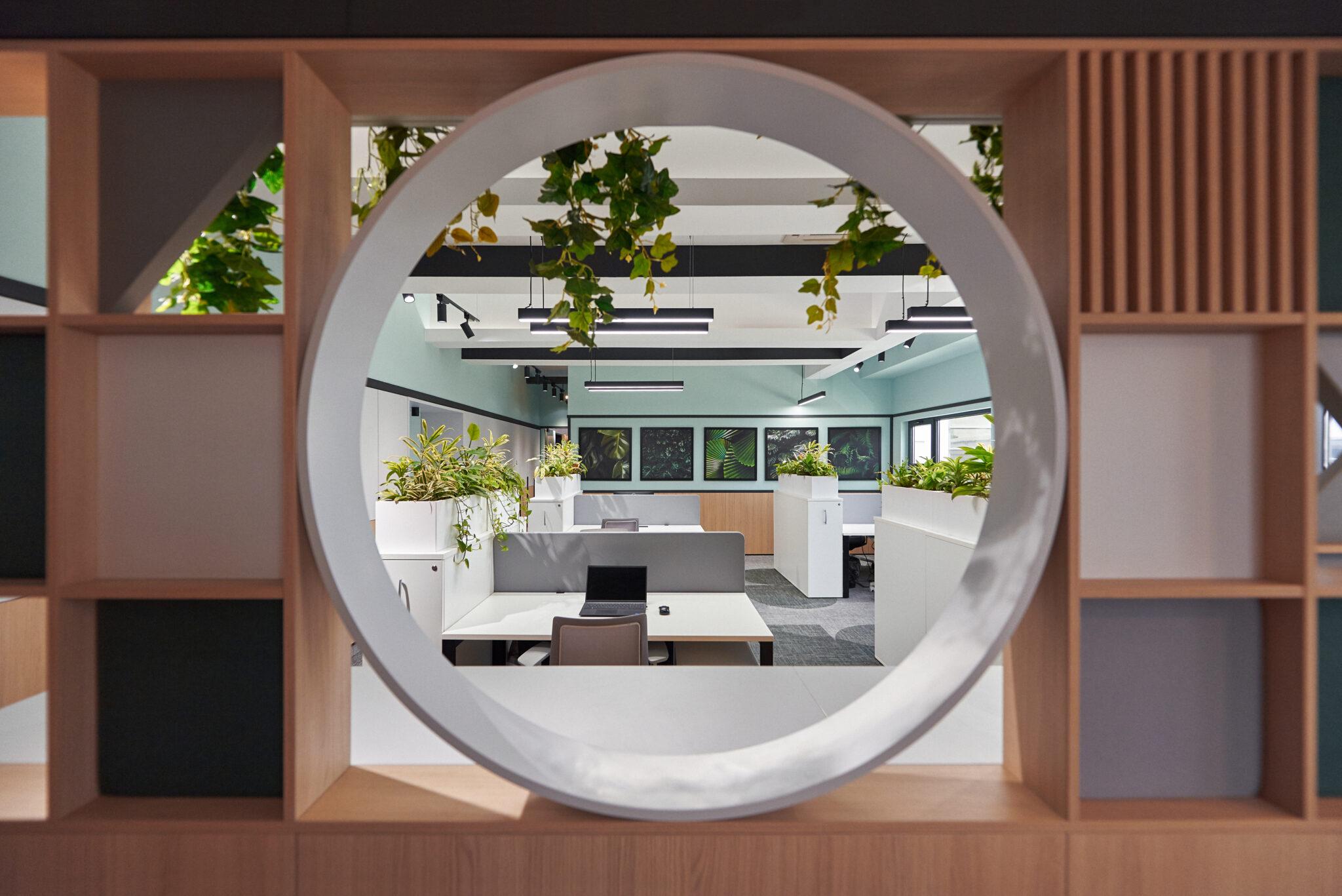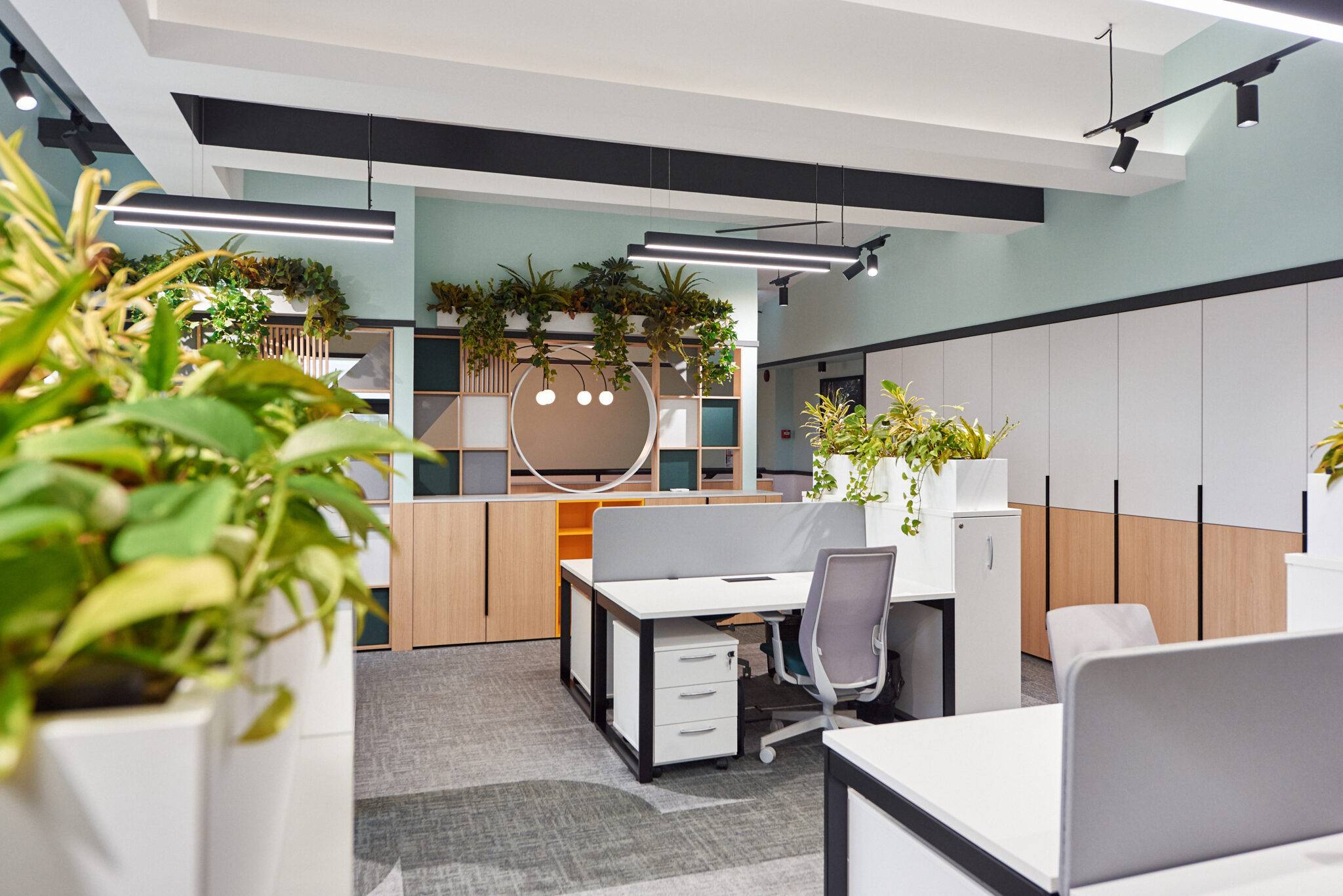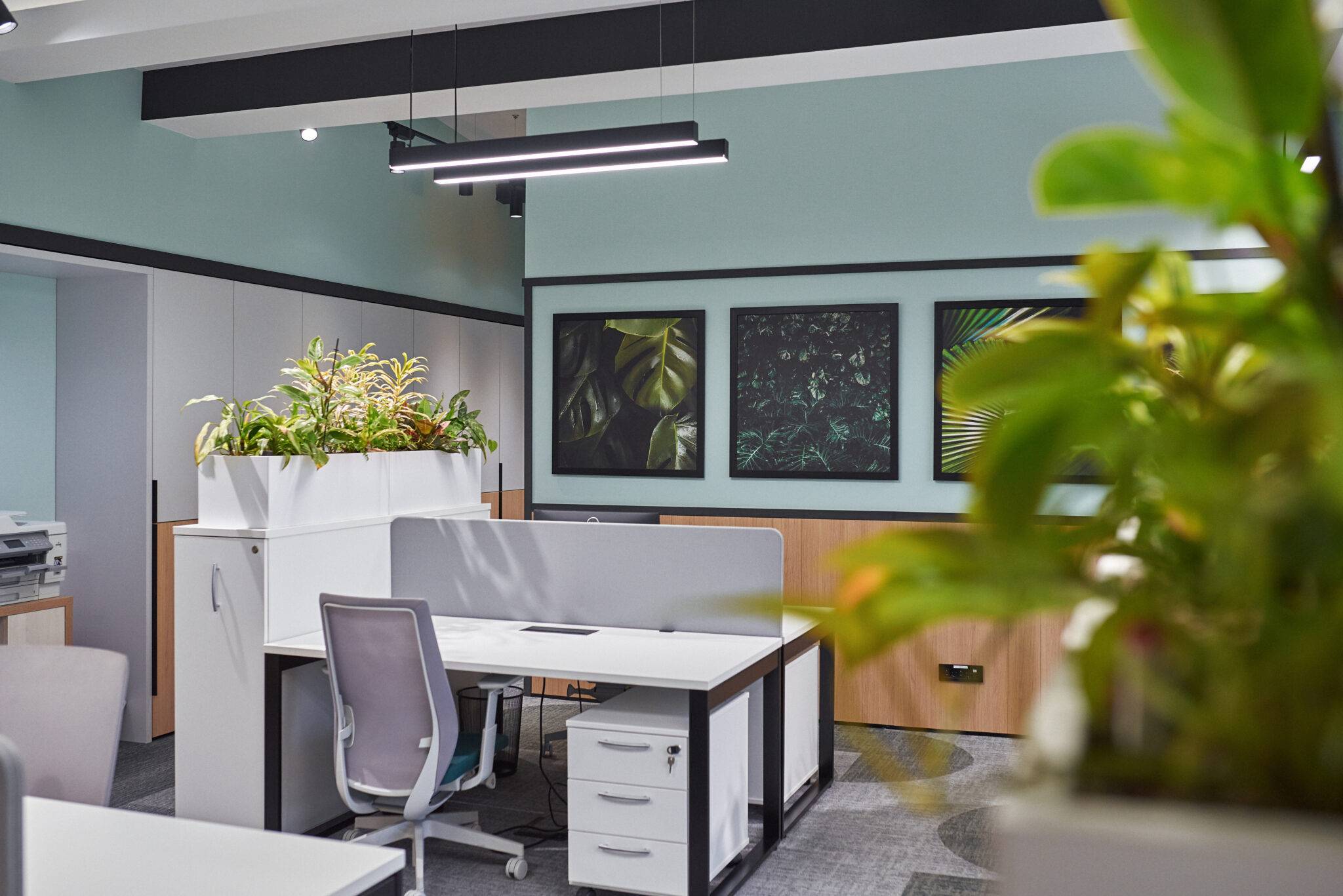 Elementele naturale sunt integrate în întregul birou, cu accente de lemn adăugând căldură și eleganță, iar verdeața luxuriantă aducând liniște și o conexiune cu natura.