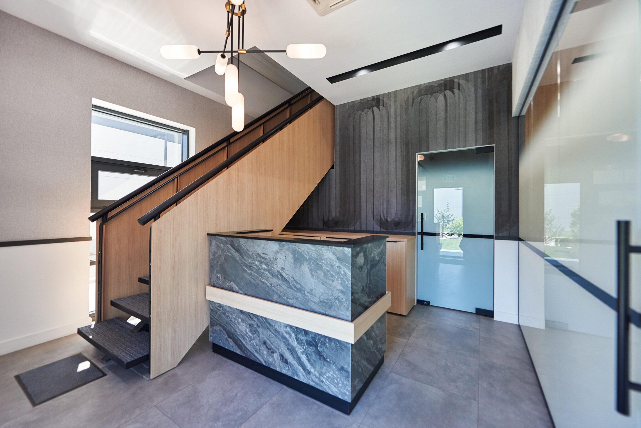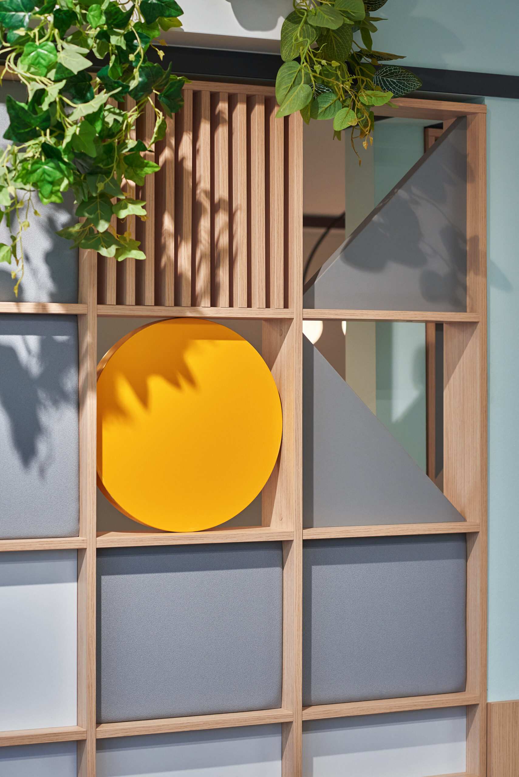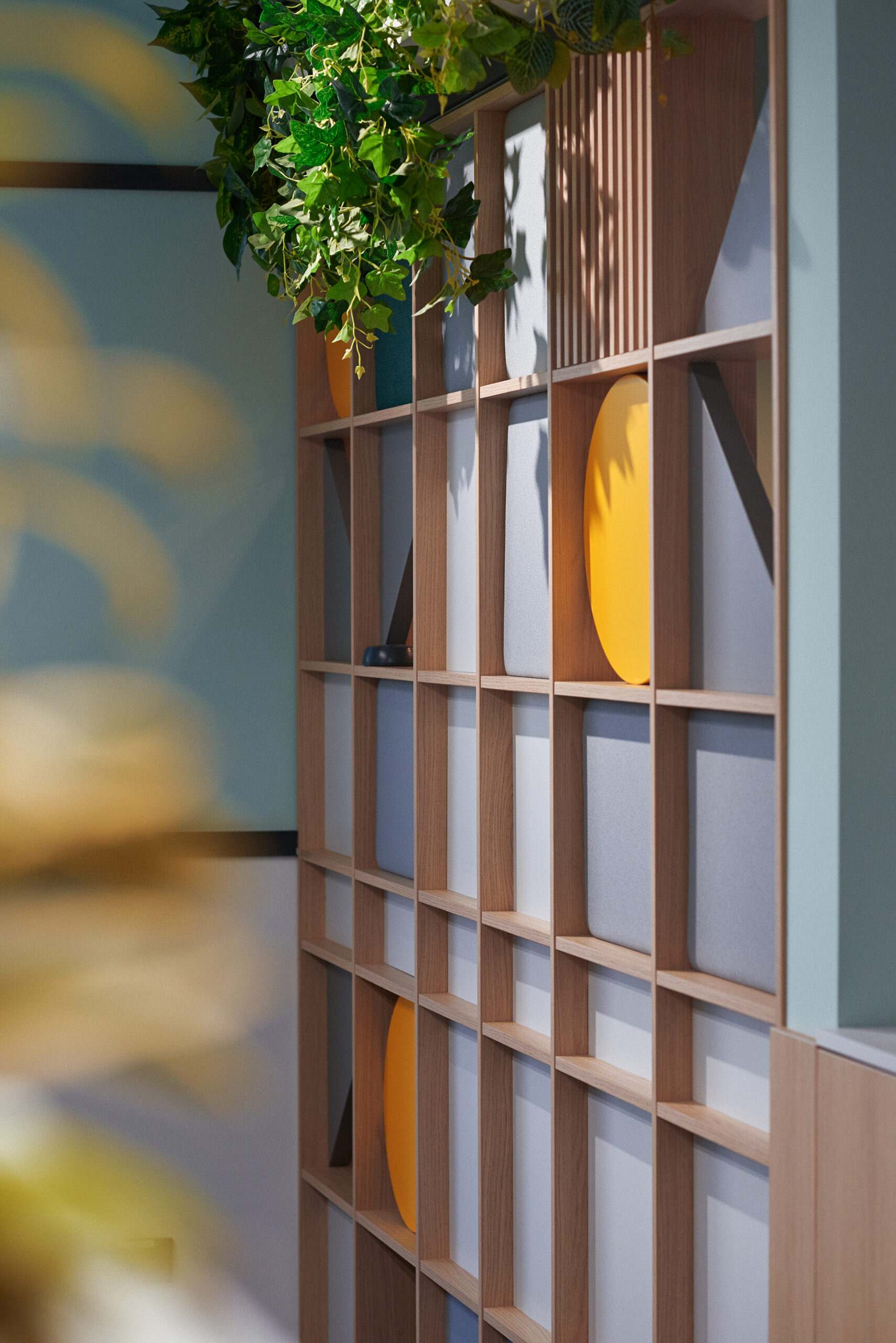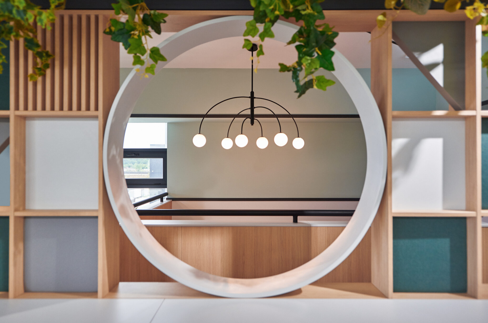 Elementele naturale sunt integrate în întregul birou, cu accente de lemn adăugând căldură și eleganță, iar verdeața luxuriantă aducând liniște și o conexiune cu natura.